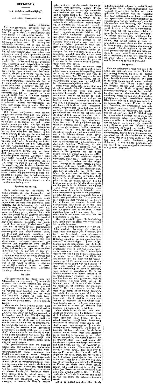 Despite missing the first day of the premiere in Berlin because the Ufa mishandled his tickets, this Dutch critic gives a positive review and calls Metropolis the most impressive film he has ever seen. METROPOLIS Berlijn, 29 Januari. _____