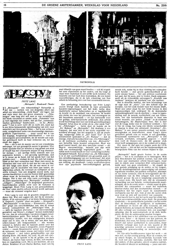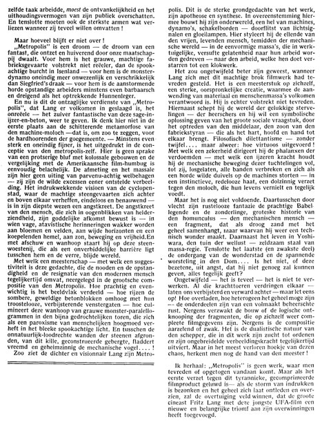 Is "Metropolis" een teleurstelling? Natuurlijk is het dat - werken van een dergelijke allure zijn altijd een teleurstelling. "Gold Rush" viel tegen: het was niets meer dan een grove clownerie - "Nibelungen" was lang niet wat men er van verwachtte: het bleek vervelend en zonder actie. "Potemkin" kon je toch eigenlijk niet anders, dan als wat "communistische achterklap" beschouwen .... en nu "Metropolis"? Dat is eerst recht dit en recht dàt, want het is een bijna benauwende opeenhoping van stof, voor misschien wel tien gewone films - het is een vermoeiende, onafgebroken reeks van stoutmoedige cinematografische experimenten .... maar vooral het is van een koppige, hooghartige individualiteit - van een intransigente persoonlijkheid, die de wereld van oudsher geïrriteerd heeft en haar irriteren zal, tot het einde der dagen.