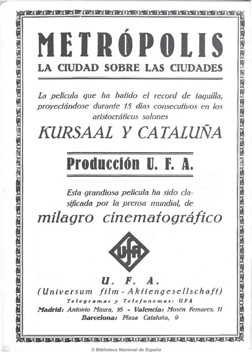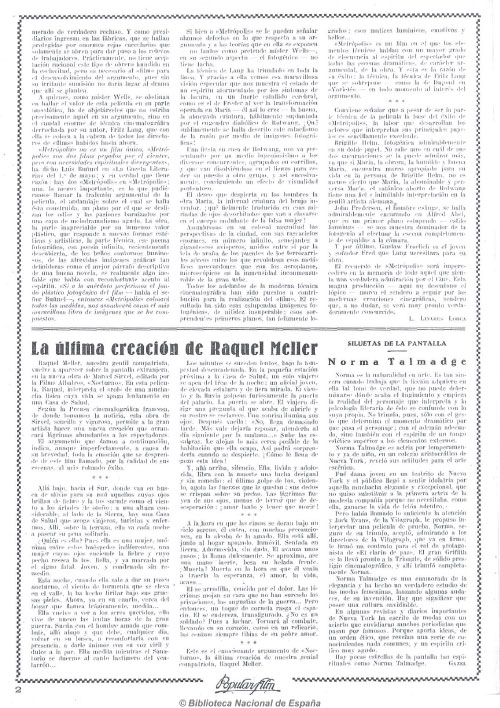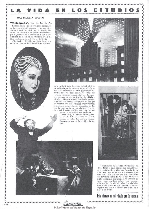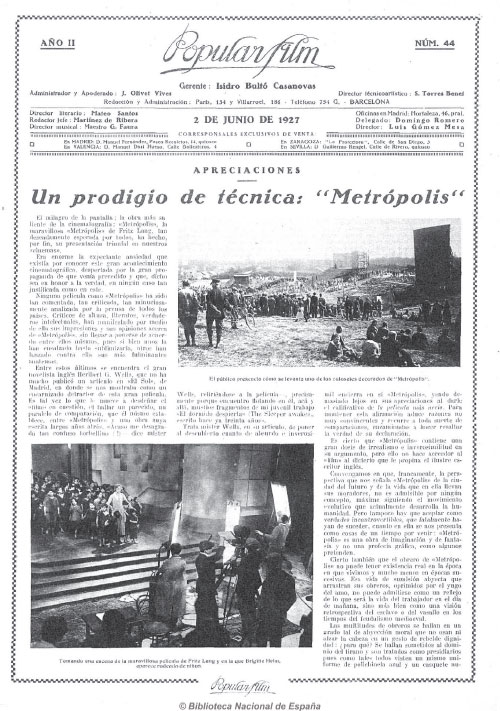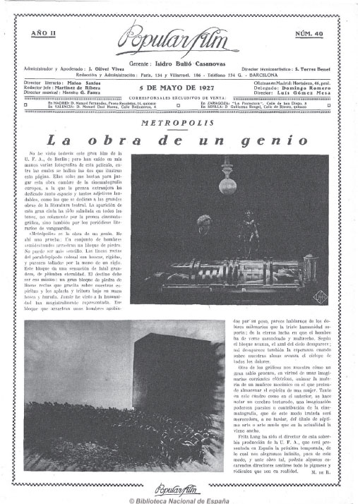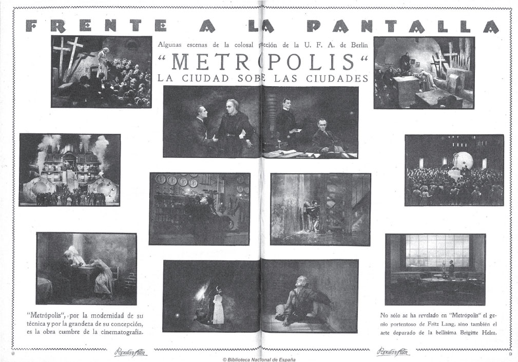 Spanish magazine Popular Film appeared between 1926 and 1934 and featured Metropolis in two editions. METRÓPOLIS FRENTE A LA PANTALLA