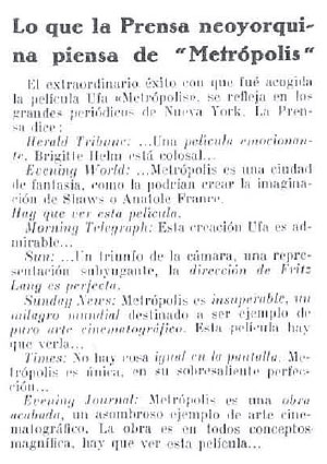 Ninguna pelicula como "Metrópolis" ha sido tan comentada , tan criticada, lan minuciosamente analizada por la prensa de todo los países. Críticos de altura, literatos, verdaderos intelectuales, han manifestado por medio de ella sus imprsiones y sus opiniones acerca de "Metrópolis", sin llegar a ponerse de acuerdo entre ellos mismos, pues si bien unos la han ensalzado hasta sublimizarla, otros han lanzado contra ella sus más fulminantes anatemas.