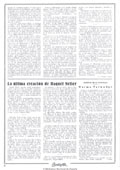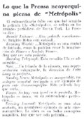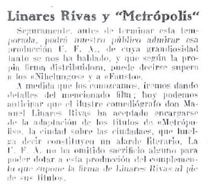 "Metrópolis nos es un film único, Metrópolis son dos films pegados por el cientre, pero con necesidades espirituales divergentes", ha dicho Luis Bu"nuel en "La Gaceta Literaria" del 1. de mayo; y en verdad que tiene razón: hay dos "Metrópolis" en "Metrópolis": una, la menos importante, es lo que pudiéramos llamar la trabazón argumental de la película, el andamiaje sobre el cual se halla ésta construida, un plano por el que se deslizan los odios y las pasiones barnizados por una capa de melodramatismo agudo. La otra, la parte inapreciable por su immenso valor plástico, que responde a nuevas formas estéticas y artisticas, la parte técnica, ese poema fotográfico, esa poesía infinita, recientemente descubierta, de los bellos, contornos luminosos, de las atrevida imágenes gráficas tan definidoras como el mjor párrafo descriptivo de una buena novela, es realmente algo inefable que habla con reconfortante acento al espiritu. "Si a la anécdota preferimos el fondo plástico fotogénico de film - habla el señor Buñuel -, entonces "Metrópolis" colmará todas las medidas, nos asombrará como el más maravilloso libro de imágenes que se ha compuesto".