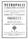 Lo más colosal que ha producido hasta ahora la cinematofrafia europea - y no nos atrevemos a decir mundial, por no reunir aún todos los elementos de juicio necesarios -, por la grandeza de la concepción y por la modernidad de la técnica, es «Metropolis", la última producción de la U.F.A. de Berlin.